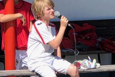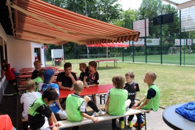 Dies gilt natürlich über den Spielfeldrand hinaus auch in den Pausen dazu. Bei den Trink-, Obst- und Essenspausen gibt es ebenfalls „Spielregeln“, die alle einhalten müssen, damit niemand zu kurz kommt. Ein Mann für alle Fälle – und im Camp nicht wegzudenken, ist Richard Hofmann. Er koordiniert die Anmeldungen und organisiert die optimale Versorgungslage in allen Pausen. Die Kinder lieben ihn und er hat stets ein freundliches und humorvolles Wort für die Kurzen. „Richard, gibt es Eis und hast Du auch Kratzeis?“, diese Frage wurde ihm wohl am häufigsten in diesem Camp von den Kindern gestellt. Am Freitag Nachmittag konnten alle, ob Trainer, Spieler oder Eltern auf ein erfolgreiches und schönes Camp zurückblicken. Die 1. Vorsitzende Petra Wilhelmi überreichte im Namen des Vorstands am Ende des Camps ein kleines Dankeschön an das Camp-Team. „Glückliche Kinder und Jugendliche am Ende des Camps sprechen für Eure gute Arbeit“, so ihre dankenden Worte an das Team.