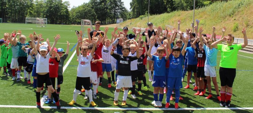 Am Anfang des Camps gab es, zur Freude der Kinder, die Camp-Überraschung. Es waren rote EFC-Kappen, die bei dem herrlichen Wetter prima als Sonnenschutz dienten. Stolz präsentierten sich die Kinder im Tor mit ihren Trainern.