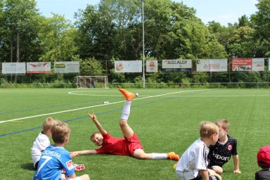 Bei den abwechslungsreichen Trainingseinheiten kamen Ballannahme, Dribbeln und Passen nicht zu kurz, aber auch der Spaß am Spiel war groß geschrieben. Die Kinder konnten sich in Spieler von unterschiedlichen Bundesligavereinen verwandeln und gegeneinander antreten, wie z.B. Eintracht Frankfurt gegen den FC Bayern. Ebenso viel Spaß brachte es den kleinen Kickern als Sportreporter über Mikrofon, die Spiele selbst zu kommentieren.
